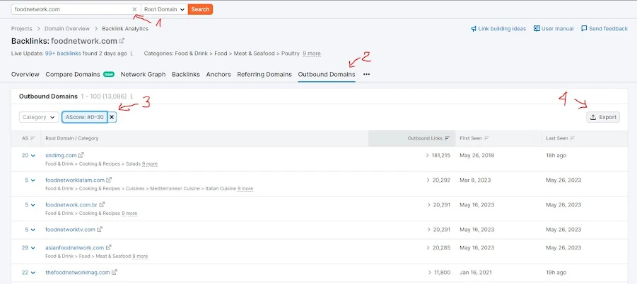 Giờ nhập website đó vào trong công cụ Backlink Analytics của SEMrush => chọn Outbound Domains